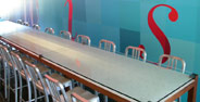 An 18 foot long central table was designed and built to accommodate large parties and to foster communal encounters.